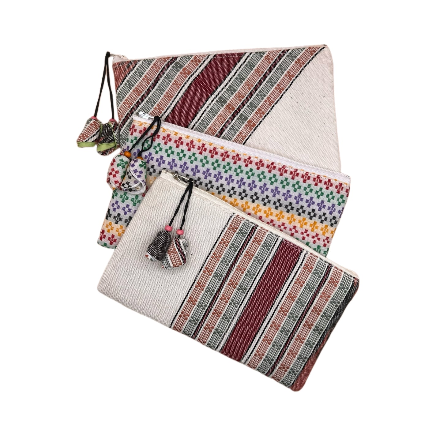 ロンジーという民族衣装の布を使用して仕立てているため、小物ごとに異なる模様を楽しめるのも、味わい深い魅力です。