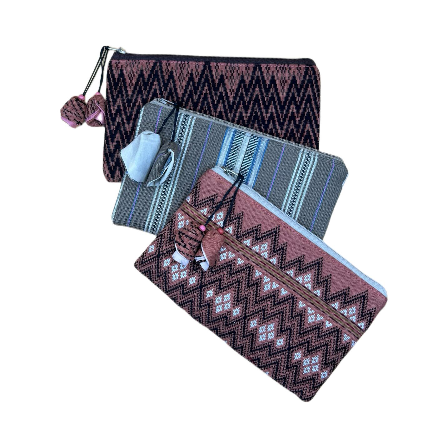 ロンジーという民族衣装の布を使用して仕立てているため、小物ごとに異なる模様を楽しめるのも、味わい深い魅力です。