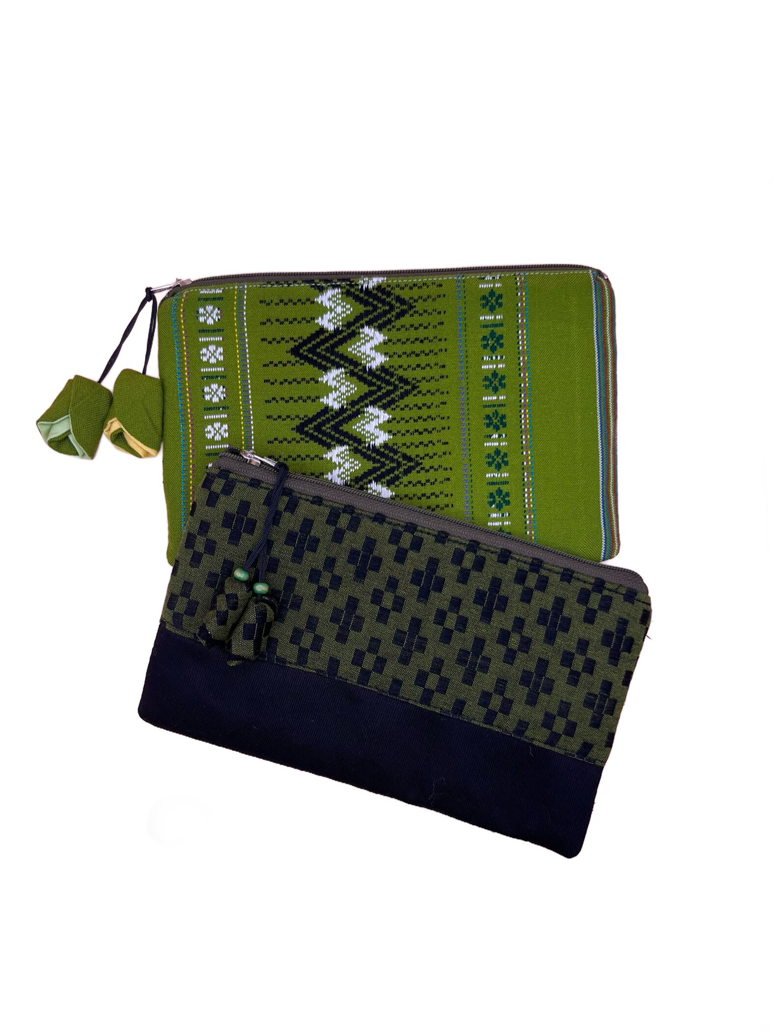 ロンジーという民族衣装の布を使用して仕立てているため、小物ごとに異なる模様を楽しめるのも、味わい深い魅力です。