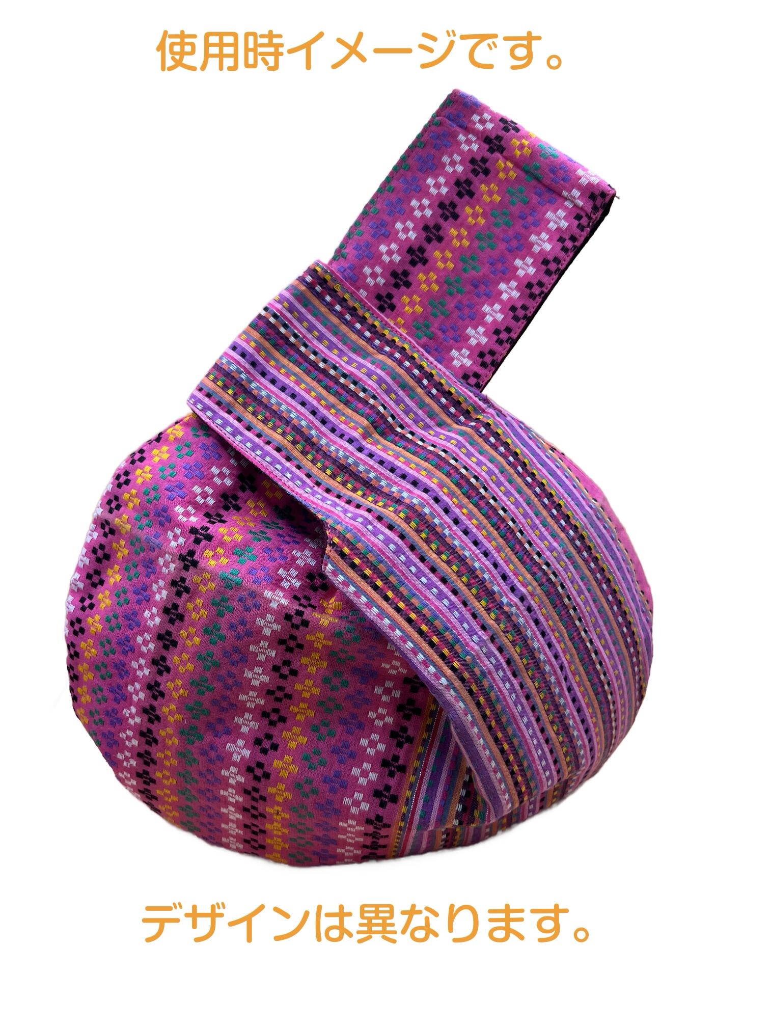 ロンジーという民族衣装の布を使用して仕立てているため、小物ごとに異なる模様を楽しめるのも、味わい深い魅力です。